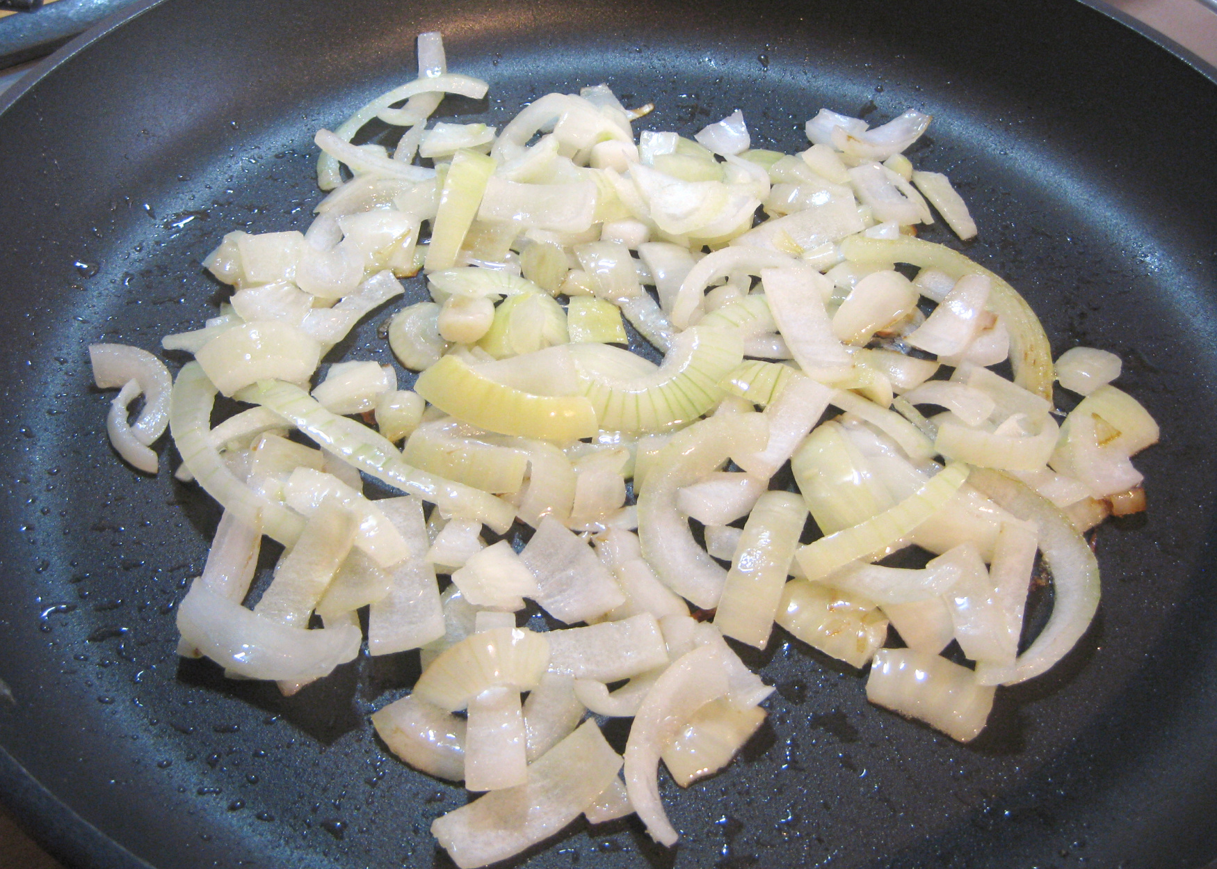 - Die Zwiebeln in halbe Ringe schneiden und bei niedriger Temperatur langsam im Öl glasig braten.