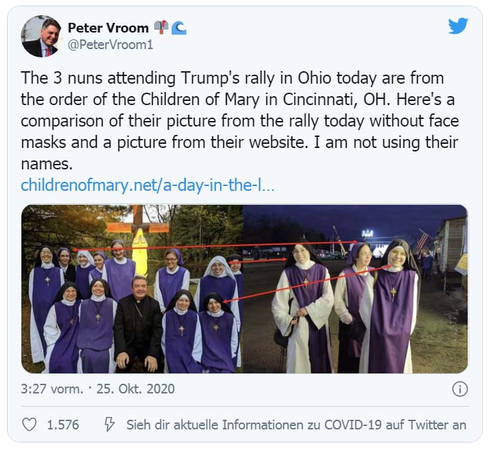 Während nun Tausende von Hexen mit Zauberkräften versuchen, die Wiederwahl von Donald Trump zu verhindern, bekommt der US-Präsident wiederum angebliche Unterstützung durch Chr*sten. Ein kürzlich aufgenommenes Video von einer Wahlveranstaltung im US-Bundesstaat Ohio zeigt drei Nonnen in der ersten Reihe hinter dem Rednerpult. Eine von ihnen hielt eine Bibel hoch, während die anderen beiden Nonnen mit Rosenkränzen in den Händen für Donald Trump beteten.
