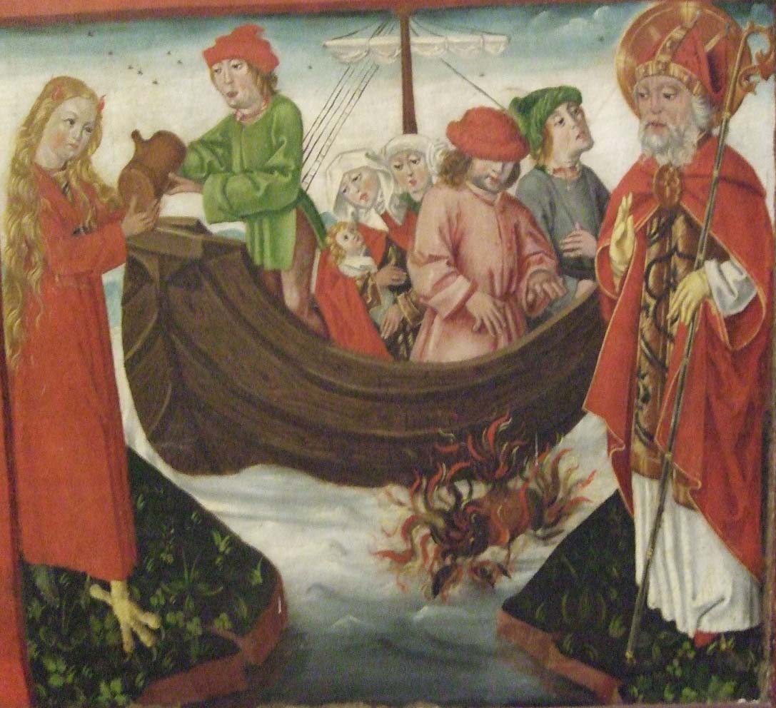 Die Entlarvung der Diana (Altartafel in der Kirche St. Mariae in Mühlhausen in Thüringen). Die Göttin übergibt die Krüge mit dem "griechischen Feuer" an die Seeleute. Die Göttin wird mit dem Rabenfuß/Krähenfuß dargestellt, um sie als Hexe zu denunzieren. Der chr**tliche Nikolaus von Myra (ganz rechts im Bild) will das verhindern.