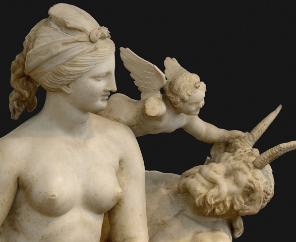 Aphrodite (mit Spiegel), PAN und Eros. PAN wird wegen seiner Hörner wieder mal zum L*zi*er, zum chr**tlichen Teufel gemacht und diesbezüglich verleumdet. Das Horn ist jedoch ein Paarungs- und Fruchtbarkeitssymbol, weshalb Eros das Horn entsprechend berührt.