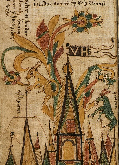 Da versetzte Har: Noch merkwürdiger jedoch ist der Hirsch Eikthyrnir, der in Walhall steht und an den Zweigen desselben Baumes nagt; und von seinem Gehörn fallen so viel Tropfen herab, daß sie nach Hwergelmir fließen, und daraus folgende Ströme entspringen: Sid, Wid, Sekin, Ekin, Swo l, Gunnthro, Fiörm, Fimbulthul, Gipul, Göpul, Gömul, Geirwimul; diese umfließen der Asen Gebiet. Aber noch diese werden genannt: Thyn, Win, Tho ll, Bo ll, Grad, Gunnthrain, Nyt, Naut, Nönn, Hrönn, Wina, Wegswin, Thiodnuma."