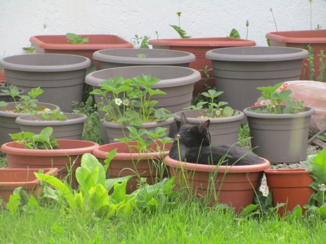 Erdbeeren im Topf zu ziehen hat den Vorteil, daß sie gleichzeitig als Katzenbett fungieren können. Updown