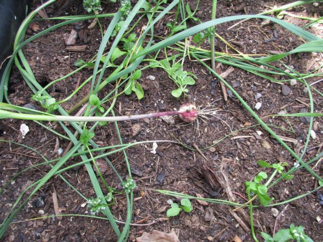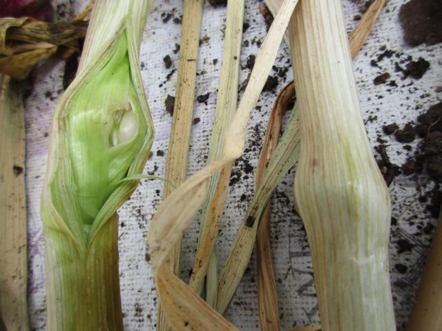 Das sieht ein wenig wild aus, aber das ist trotzdem in Ordnung, manchmal knickt Knoblauch eben um, das macht aber nichts weiter. Einfach weiterwachsen lassen. Dies waren Brutzwiebelchen, Bulbillen, eines habe ich mal rausgezogen, es sind ganz ordentliche Rundlinge geworden, auch wenn sie umgeknickt sind.