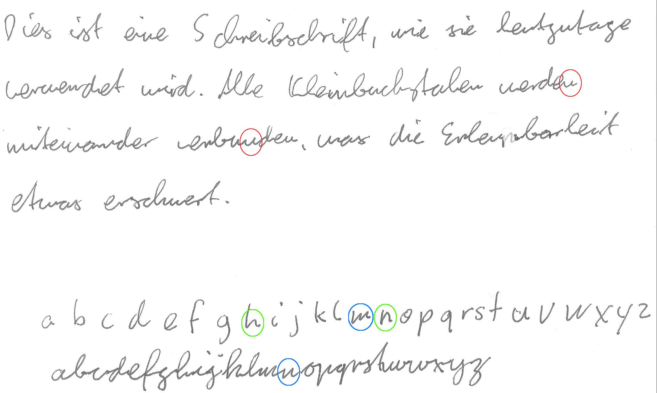 Interessanterweise finde ich zur Wellenform bei mir im Schriftbild nichts - oder können auch wechselnde Ober- und Unterlängen zur Wellenform beitragen? Die beiden letzteren Typen kann ich gut einordnen, die erste Form aber - also Wellenform - ist ein großes "?" für mich. Abseits vom "u->n" (das machen ja wirklich sehr viele bzw. die meisten Leute) fehlt mir da jetzt ein zuverlässiger Anhaltspunkt, wie das in der Praxis aussehen soll.