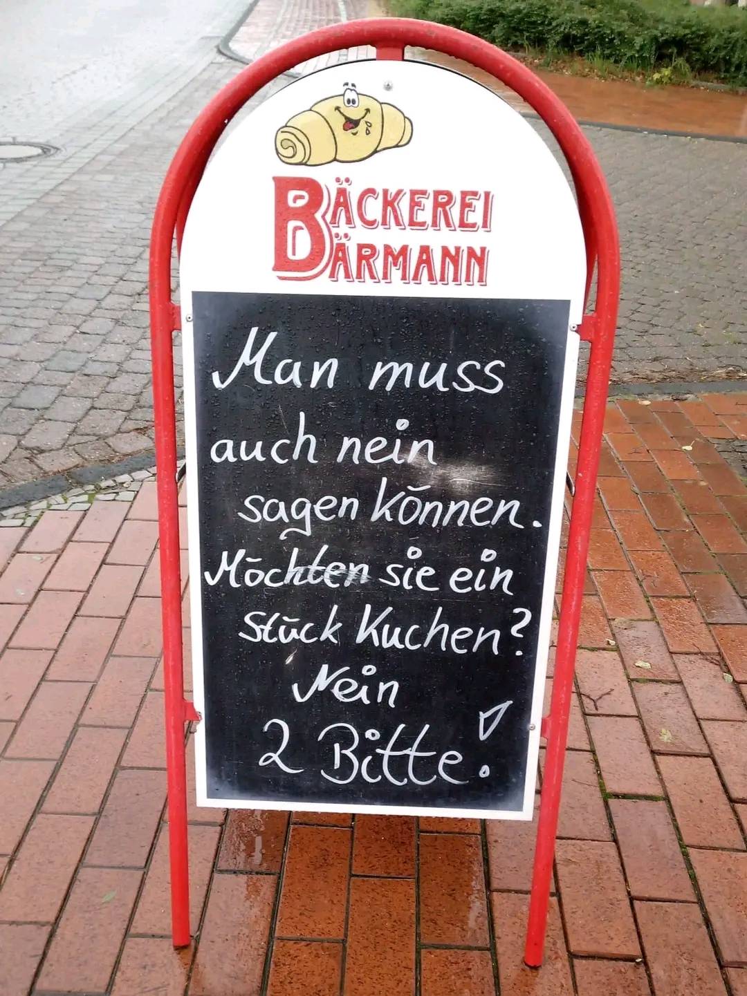 Jedenfalls bin ich dann rein in den Bäcker und habe die Verkäuferin gefragt, wer das auf dem Schild geschrieben hat. Sie hob kleinlaut die Hand und fragte, ob sie wohl etwas falsch geschrieben hätte?