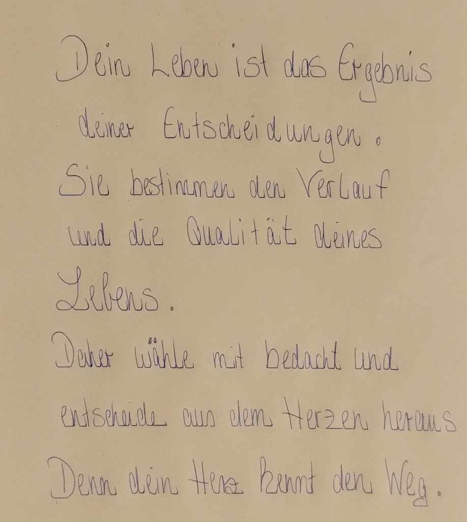 Das bedeutet, dieser Schreiber sucht bzw. braucht oder bevorzugt Führung. Liegt irgendwie auf der Hand, oder? Mit Führung ist hier ein anderer Mensch, ein Berater gemeint. Das kann der Partner sein, der Vorgesetzte auf Arbeit, der beste Freund usw. Aber auch ein Leitfaden im Leben kommt hier in Betracht, eine religiöse Ansicht, ein Glauben an die alten Götter z. B. Auch Menschen, die bevorzugt auf liniertem (oder kariertem) Papier schreiben, gehören zu der oben genannten Gruppe von Menschen. Spätestens jetzt überlegt jeder, der das gerade liest, wie er es handhabt. Und dann fällt den meisten auf, daß sie kaum bis gar nicht mehr mit der Hand schreiben, sondern alles nur noch digital abläuft. Schade, wirklich schade, denn auch das ist ein weiterer Schritt in die Vereinheitlichung, Gleichmachung der Menschen. Alles Individuelle soll entfernt werden. Und eine Handschrift ist nun mal sehr individuell. Vergleicht man eine digitale Textnachricht mit ihrer Autokorrektur und eine handschriftliche Nachricht, bei der man selbst nachdenken muß, wie dieses oder jene Wort sich schreibt, erkennt man deutlich, wie die Menschen durch die Digitalisierung dressiert werden. Die meisten Menschen schreiben bevorzugt auf Linien. Das ist keine Wertung im Sinne von positiv oder negativ. Es ist ein Hinweis darauf, daß derjenige nicht alle Entscheidungen alleine treffen möchte. Verantwortung für dieses oder jenes darf gerne geteilt werden.