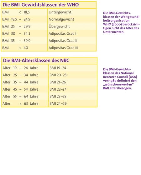 Krankenkassen empfehlen die Tabelle des National Research Councils (rechts unten) mit zu Rate zu ziehen. Denn mit zunehmendem Alter steigt der BMI zumeist, auch bei gesunder Lebensweise. Und das ist gut so! Denn dies stärkt die Immunität und erhöht die Überlebenschancen bei vielen Infektionskrankheiten.