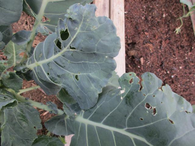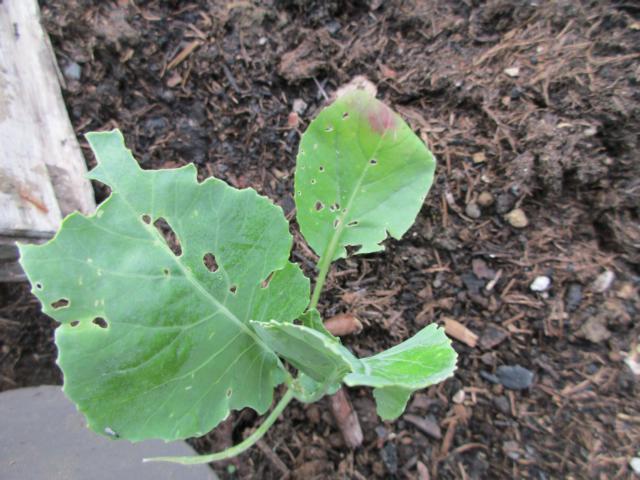 Dafür Mottenschildläuse. Das sind diese kleinen weißen Fliegen, man nennt sie deshalb auch Weiße Fliege, die so auffliegen, wenn man die Pflanze berührt. Daran erkennt man dann den Befall. Es waren wenige, und da ich eh alle Blätter nach Eiern vom Kohlweißliing absuchte, habe ich die kleinen weißen Eier und Gespinste von der Weißen Fliege dann einfach abgerieben. Waren auch nur wenige. Aber ein anderes Viecherl hat einen Schaden angerichtet: Das sieht mir nach Erdflöhen aus. Das sind keine Flöhe, sondern Käfer, sie können springen, daher nennt man sie Flöhe. Gesehen habe ich keinen, aber ich denke doch, daß es Erdflöhe sind. Sie fressen nämlich genau solche kleinen Löcher in die Pflanzen. Und irgendwann sehen die Pflanzen dann so aus: Zum Glück ist es nur eine, die einen solchen Schaden davontrug. Gegenmaßnahme gegen Erdflöhe: Bestreuen mit Gesteinsmehl. Wenn man gerade keines dahat, Roggenmehl geht auch. Gegen die Weiße Fliege: Bei überschaubaren Mengen würde ich einfach abreiben. Bei starkem Befall kann man mit einem Rapsöl-Wassergemisch einsprühen, im Verhältnis 1:3 etwa. Oder bei größeren Blättern mit einem Pinsel einpinseln, vor allem die Blattunterseiten bzw. nur die Blattunterseiten, ich könnte mir vorstellen, daß das nicht so gut ist, das gesamte Blatt von beiden Seiten "einzuölen". Gegen die Kohlfliege hilft gut ein vorbeugender Kohlkragen. Das ist eine Platte aus Filz oder auch Karton, die man um den Kohlstrunk legt. Denn die Kohlfliege legt an jener Stelle ihre Eier ab, die dann, wenn sie auf dem Filz oder der Pappe landen, vertrocknen, bevor überhaupt was schlüpft. Sie sieht ähnlich aus wie eine Fliege. Für so einen Kohlkragen schneidet man in die Mitte des Materials, z. B. ein Stück Pappe, ein kleines Loch, macht einen Schnitt von außen bis zur Mitte und legt diesen "Kragen" dann um den Kohlstrunk. Wenn der Kohl dann wächst, sollte man ihn mal erneuern, mit entsprechend größerem Loch in der Mitte. Und das ist auch das Einzige, was hilft gegen die Kohlfliege, denn hat sie einmal Eier gelegt, war es das in der Regel für die Pflanze. Sie frißt die Wurzel an und später auch das Gemüse selbst. Man erkennt den Befall erst, wenn die Pflanze im Grunde schon eingeht. Gegen den Kohlweißling, der weiße Falter, hilft einmal Absammeln, bereits die Eier oder später die Raupen. Und das Zwischenpflanzen von anderen, geruchsintensiven Pflanzen hält ihn meist fern. Basilikum, auch andere stark riechende Kräuter, oder auch Studentenblumen (Tagetes). Gegen alles zusammen hilft das Spannen von Kohlschutznetzen/Gemüseschutznetzen.