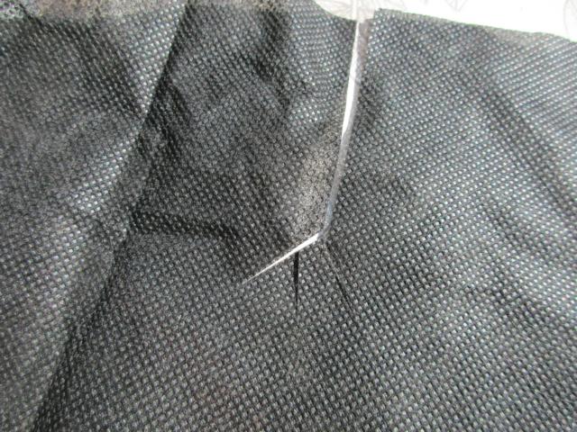 Ich habe Unkrautvlies genommen, in Stücke geschnitten, bis etwa zur Mitte eingeschnitten und innen dann einfach zwei-, dreimal schräg eingeschnitten. So passen sie sich auch gut jeder Strunkstärke an. Man kann das ja auch schön ordentlich machen. Ich habe einfach alle auf einen Stapel und gemeinsam geschnitten. Dann um die Pflanze legen, etwas überlappen lassen und beschweren, damit es nicht aufweht. Ich werde vielleicht Steinchen auf alle legen oder nochmal Gesteinsmehl obenaufstreuen.