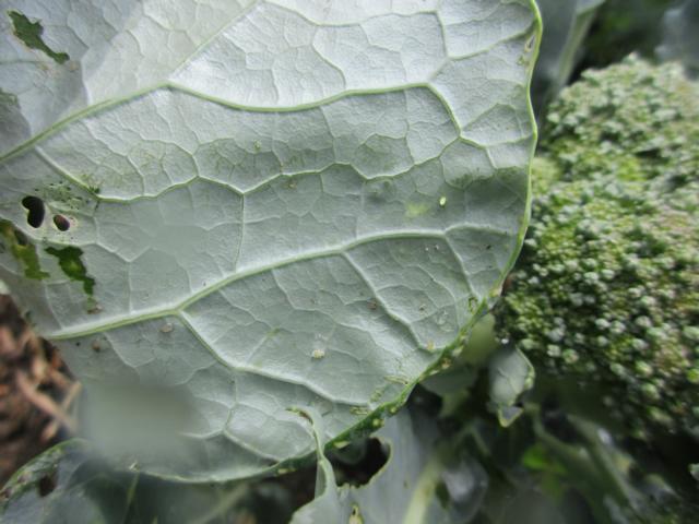Auf dem linken der zwei mittigen Blättchen, ein Erdfloh. Der ist es auch, der gerade so aktiv am Fressen ist. So sieht die Eiablage des großen Kohlweißlings aus. Und so die vom kleinen Kohlweißling, ein einzelnes Ei, man muß schon genau hinsehen. Ziemlich außen rechts am Blatt. Und weiter unten krabbelt was Grünes, vielleicht ein junger Erdfloh? Die Früchte entwickeln sich schon, ich muß also dranbleiben. Nach den Eiern muß regelmäßig kontrolliert werden, und wenn die Erdflöhe mit Gesteinsmehl nicht vertrieben werden können, probiere ich das mal mit dem Raupenleim. Auch an einem Baum sind dieses Jahr viele Läuse, hat das jetzt noch Sinn, auch den Baumstamm zu streichen damit?