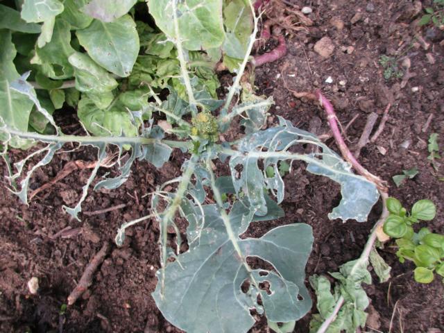 Dafür Mottenschildläuse. Das sind diese kleinen weißen Fliegen, man nennt sie deshalb auch Weiße Fliege, die so auffliegen, wenn man die Pflanze berührt. Daran erkennt man dann den Befall. Es waren wenige, und da ich eh alle Blätter nach Eiern vom Kohlweißliing absuchte, habe ich die kleinen weißen Eier und Gespinste von der Weißen Fliege dann einfach abgerieben. Waren auch nur wenige. Aber ein anderes Viecherl hat einen Schaden angerichtet: Das sieht mir nach Erdflöhen aus. Das sind keine Flöhe, sondern Käfer, sie können springen, daher nennt man sie Flöhe. Gesehen habe ich keinen, aber ich denke doch, daß es Erdflöhe sind. Sie fressen nämlich genau solche kleinen Löcher in die Pflanzen. Und irgendwann sehen die Pflanzen dann so aus: Zum Glück ist es nur eine, die einen solchen Schaden davontrug. Gegenmaßnahme gegen Erdflöhe: Bestreuen mit Gesteinsmehl. Wenn man gerade keines dahat, Roggenmehl geht auch. Gegen die Weiße Fliege: Bei überschaubaren Mengen würde ich einfach abreiben. Bei starkem Befall kann man mit einem Rapsöl-Wassergemisch einsprühen, im Verhältnis 1:3 etwa. Oder bei größeren Blättern mit einem Pinsel einpinseln, vor allem die Blattunterseiten bzw. nur die Blattunterseiten, ich könnte mir vorstellen, daß das nicht so gut ist, das gesamte Blatt von beiden Seiten "einzuölen". Gegen die Kohlfliege hilft gut ein vorbeugender Kohlkragen. Das ist eine Platte aus Filz oder auch Karton, die man um den Kohlstrunk legt. Denn die Kohlfliege legt an jener Stelle ihre Eier ab, die dann, wenn sie auf dem Filz oder der Pappe landen, vertrocknen, bevor überhaupt was schlüpft. Sie sieht ähnlich aus wie eine Fliege. Für so einen Kohlkragen schneidet man in die Mitte des Materials, z. B. ein Stück Pappe, ein kleines Loch, macht einen Schnitt von außen bis zur Mitte und legt diesen "Kragen" dann um den Kohlstrunk. Wenn der Kohl dann wächst, sollte man ihn mal erneuern, mit entsprechend größerem Loch in der Mitte. Und das ist auch das Einzige, was hilft gegen die Kohlfliege, denn hat sie einmal Eier gelegt, war es das in der Regel für die Pflanze. Sie frißt die Wurzel an und später auch das Gemüse selbst. Man erkennt den Befall erst, wenn die Pflanze im Grunde schon eingeht. Gegen den Kohlweißling, der weiße Falter, hilft einmal Absammeln, bereits die Eier oder später die Raupen. Und das Zwischenpflanzen von anderen, geruchsintensiven Pflanzen hält ihn meist fern. Basilikum, auch andere stark riechende Kräuter, oder auch Studentenblumen (Tagetes). Gegen alles zusammen hilft das Spannen von Kohlschutznetzen/Gemüseschutznetzen.
