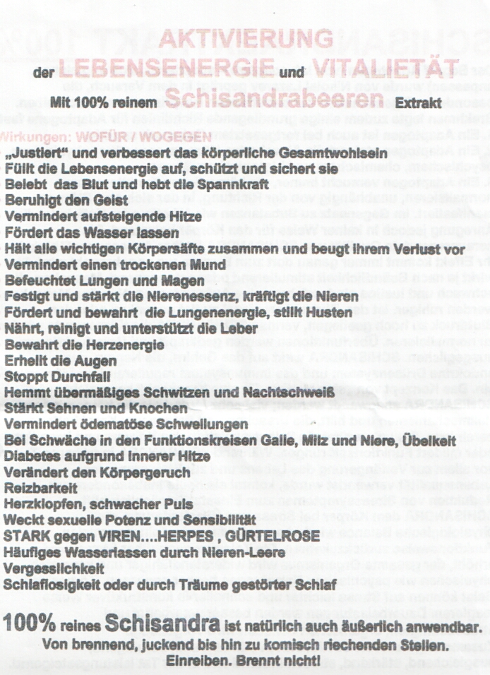 Ich habe noch keine persönlichen Erfahrungen mit der Schisandra-Beere gemacht, aber weiß aus nächster Nähe, dass sie ähnlich wie Ginseng verwendet wird. Wie der zweite Handzettel gut erklärt, gehört die Schisandra-Beere zu den Adaptogene, also Pflanzen, die den Körper wieder ins Gleichgewicht verhelfen sollen.