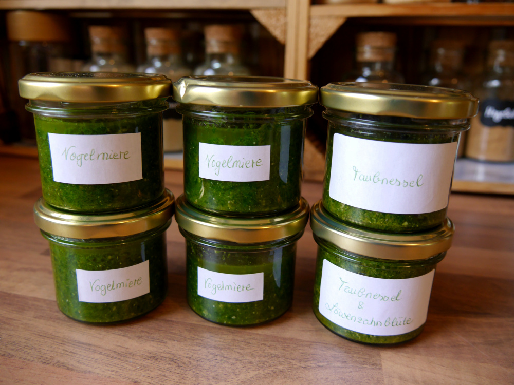Die Vogelmiere-Pesto ist von der Konsistenz her etwas schleimig und sagt uns auch geschmacklich nicht zu. Sie schmeckt frisch gepflückt viel besser. Diese Pesto werden wir also nach und nach in Suppen und Salaten mitverarbeiten. Die Taubnesselpesto muss noch bewertet werden. :-)