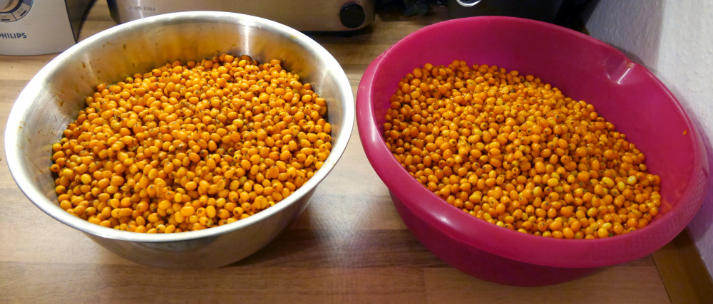 Hier seht ihr 6330 Gramm frische Sanddornbeeren, jede einzelne liebevoll vom Zweig getrennt. Das Esszimmer sieht aus, als hätte ein Sand(dorn)sturm gewütet.