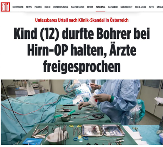 Durch eine anonyme Anzeige kam der Fall ein halbes Jahr später ans Licht. Beide Angeklagten wurden entlassen und angeklagt. Das Urteil kam danach jedoch überraschend: Die Ärzte wurden mangels Beweisen freigesprochen. Das Kind hielt angeblich einen chirurgischen Bohrer nur mit einer Hand, bohrte das Loch aber nicht selbst.