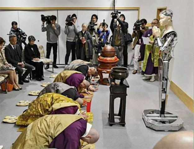 Der Androide Mindar ist der buddhistischen Gottheit für Gnade nachempfunden und hält seine Predigten im Kodaiji-Tempel in Kyoto. Seine menschlichen Kollegen sagen vorher, daß der Robo-Priester dank seiner künstlichen Intelligenz eines Tages unbegrenzte Weisheit erlangen könnte.