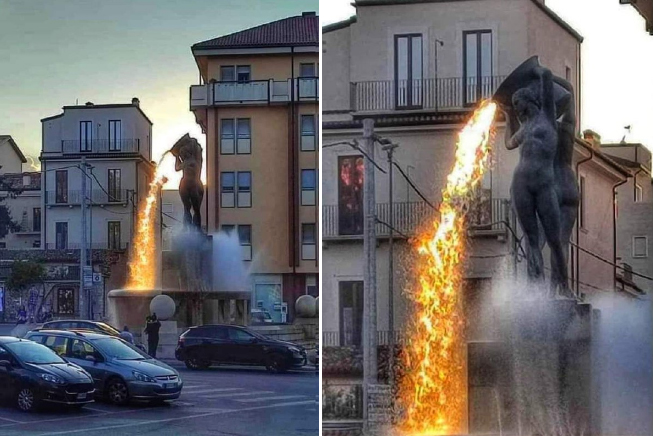 Der heute als "faschistisches Bauwerk" beschimpfte Brunnen von L'Aquila in Abruzzen (Abruzzo). Zu einer bestimmten Tageszeit, wenn Sonnenlicht durch die Lücke zwischen zwei Gebäuden fällt, sieht es so aus, als würden die beide Najaden (Nymphen) Feuer in das Wasser sprühen. Einfach nur magisch, wunderschön, großartig!