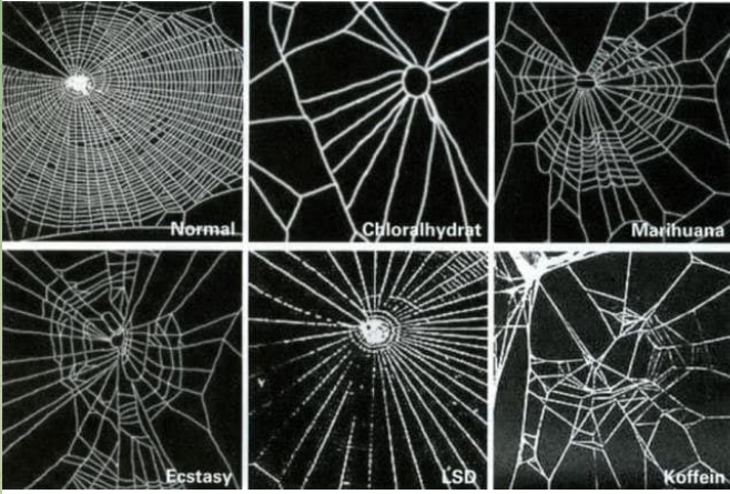 Man untersuchte die Auswirkungen verschiedener psychoaktiver Substanzen auf die Fähigkeit von Spinnen, ein Netz zu weben. Unten rechts Koffein.