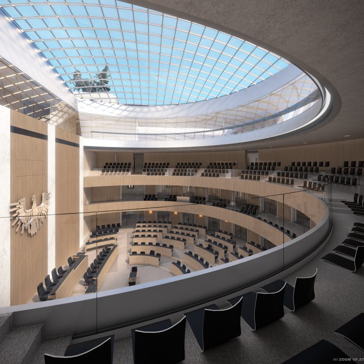 Als nächstes möchte ich auf den Sitzungssaal des Nationalrats eingehen. Ähnlich wie beim Besucherzentrum, handelt es sich hier ebensowenig um die 1. große Veränderung. Der Original-Saal wurde im Krieg zerstört, und die Sanierung betrifft damit also nur eine weitere, bereits errichtete moderne Interpretation seines klassizistischen Ursprungs. Zu erwähnen ist allerdings, dass erstmalig die Dachform dafür verändert wird. Statt des bestehenden Spitzdaches kommt eine Glaskuppel.