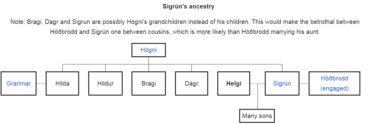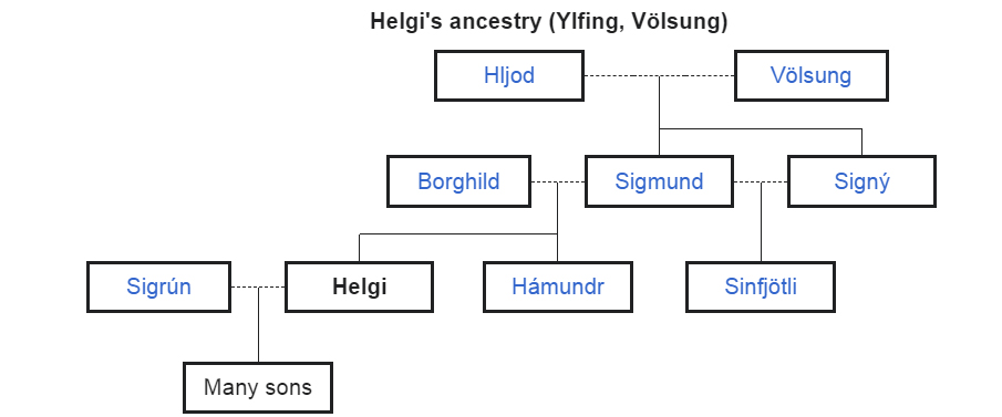 Mit seiner Zwillingsschwester Signy hatte Helgis Vater Sigmund bereits einen Sohn, Sinfiötli, gezeugt – über den oben bereits berichtet wurde. Daher war Sinfiötli Helgis Halbbruder und gleichzeitig sein Neffe. Sigmund und Sinfiötli waren Wolfsmenschen, das heißt Wolfsreiter bzw. Werwölfe.