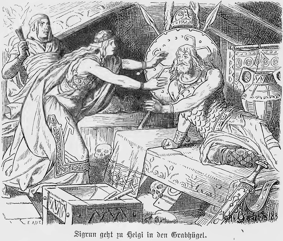 Sigrun ging in den Totenhügel zu Helgi, küßte ihn, trocknete seine Wunden und sprach zu ihm: "Dein Haar ist durchreift, mit Blut bist du bedeckt, deine Hände sind feuchtkalt; – wie soll ich dir dafür Abhilfe schaffen?"