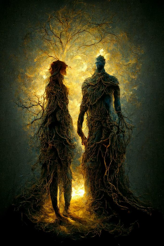 Männliche und weibliche Kräfte, aussendende und aufnehmende Kräfte, Ursache und Wirkung. Ein Erschaffungsprozesse, den wir in allen Lebenslagen wiederfinden. In dieser Geschichte ist die Zeugung der Menschen in ihrer festen Hülle niedergeschrieben. Verbunden mit dem Baum als Symbol für das Leben selbst.