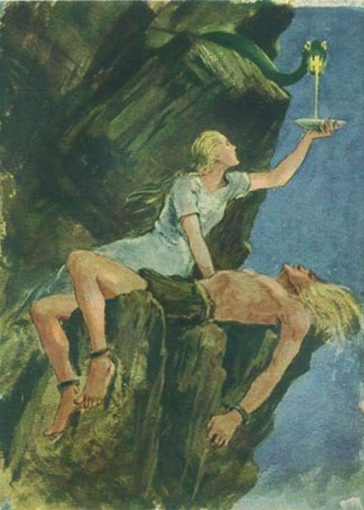 Narfis Eingeweide wurden dann verwendet, um seinen Vater Loki in einer abgelegenen Höhle an drei Felsen zu ketten. Dort wurde eine giftige Schlange über Lokis Kopf platziert, um für die Ewigkeit Gift auf sein Gesicht zu tropfen. Dies verursachte extreme Schmerzen, was dazu führte, daß sich sein ganzer Körper verkrampfte und Erdbeben durch die neun nordischen Welten schickte.