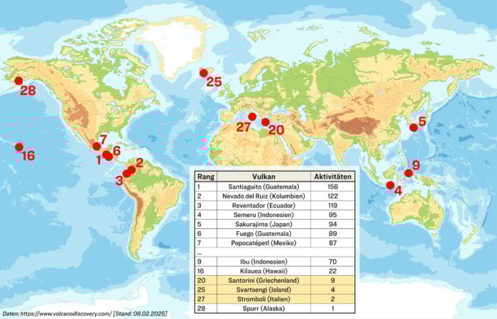 Die Ruhe vor dem Sturm könnte dagegen in Griechenland und auf Island herrschen, wo überdurchschnittlich viele Erdbeben die Region erschüttern. Ob es auf Santorini zu einem baldigen Ausbruch kommt, ist unklar.
