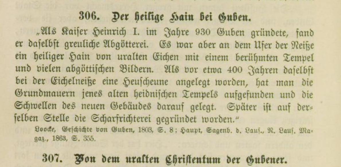 Einst lebten im heutigen Guben die Semnonen mit ihren heidnischen Bräuchen und Sitten. Ihr Tempel stand in einem heiligen Eichenhain an der Neiße. Unsere wahren und echten Götter wurden hier verehrt. Ihre Bildnisse schmückten den Heiligen Ort.