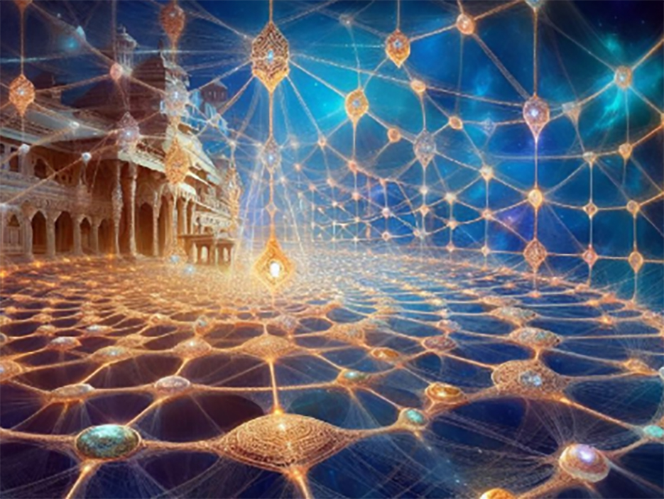 Das Netz ist unendlich, und an jedem seiner Kreuzungspunkte befindet sich ein Juwel, das die anderen unendlich widerspiegelt und mit Lebenskraft versorgt.