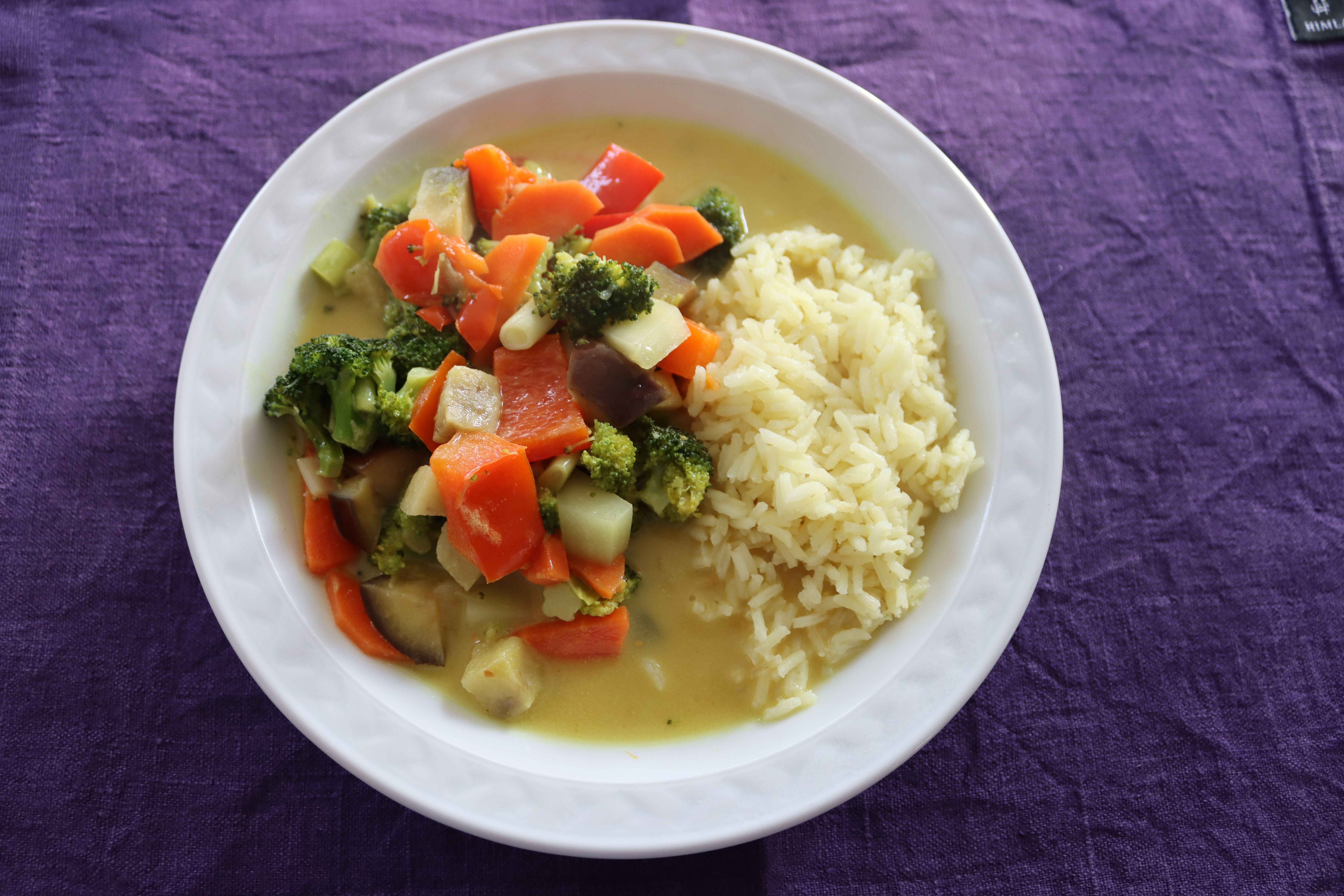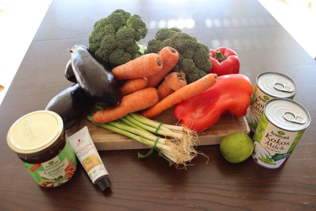 Das Kökosöl in der Pfanne erhitzen und evtl. Knoblauch, Brokkoli, Möhren und Paprika ca 3 Minuten anbraten. Anschließend die Aubergine und die Lauchzwiebel mit dazugeben und weitere 4 Minuten braten. Kokosmilch, Currypaste, Zitronen- oder Limettensaft dazugeben und aufkochen lassen. Weitere 5-7 Minuten köcheln lassen und anschließend mit dem Reis servieren.