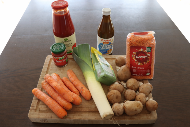 Die Zwiebeln, den Knoblauch und die Möhren schälen und in kleine Würfel schneiden. Den Lauch waschen und in dünne Ringe schneiden. Die Champignons putzen und in Würfel schneiden. Die Zwiebeln und den Knoblauch in einem Topf mit Olivenöl anschwitzen, danach die Möhren, den Lauch und die Champignons zufügen. Das Tomatenmark in den Topf geben. Nach 5 Minuten mit der Gemüsebrühe und den stückigen Tomaten/Passata ablöschen und die roten Linsen unter Rühren in den Topf geben und mit den italienischen Kräuter, Pfeffer und Salz würzen. Alles weitere 20 Minuten köcheln lassen.